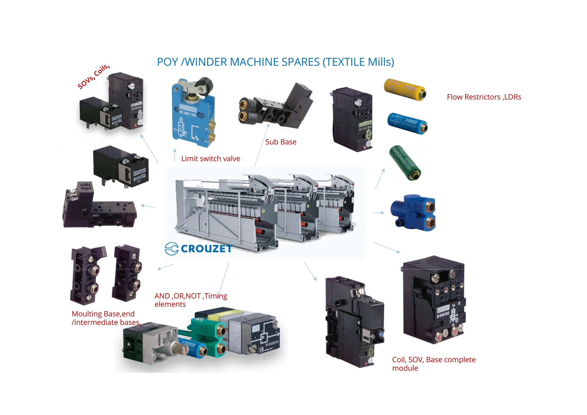 Textile POY & Winder machine Pneumatic spares, Valve, Solenoid, Coil, Flow Restrictor, etc.