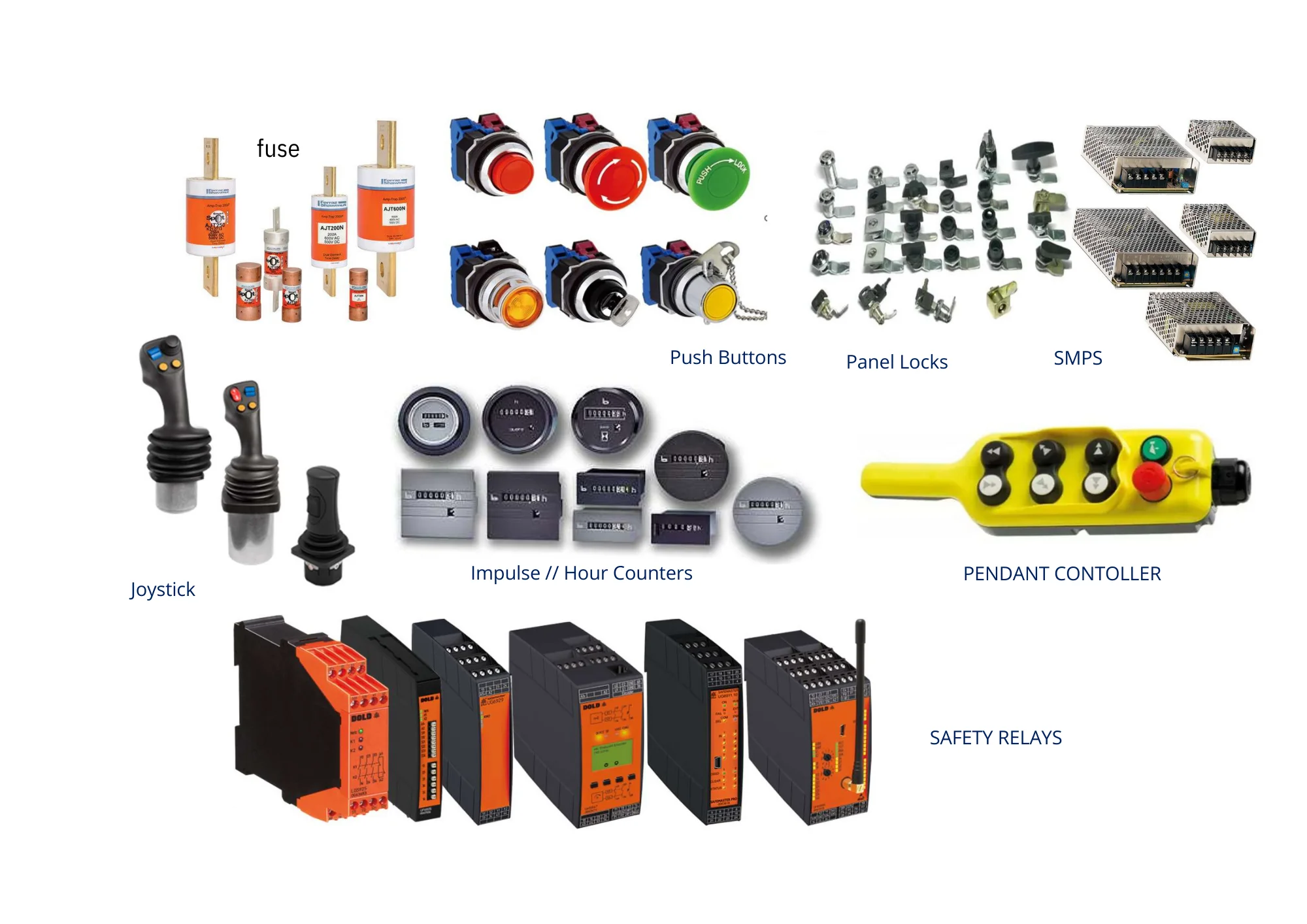 Timer, Counters, Limit, Position & Micro Switches, Contactors, Overload Relay, Breakers, Fuses, IGBTs, etc.